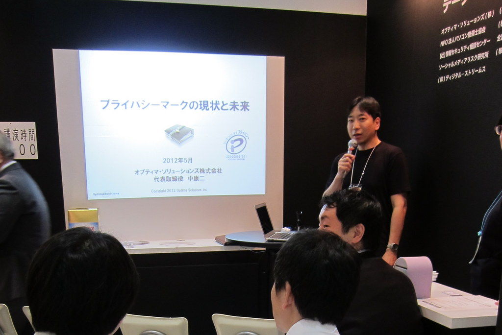 5月9日(水)、情報セキュリティEXPO(東京ビッグサイトで開催)の会場内「データセキュリティコンソーシアムブース」において、私(中康二)が「プライバシーマークの現状と未来」と題した講演を行いました。